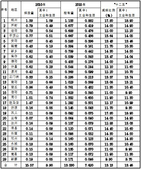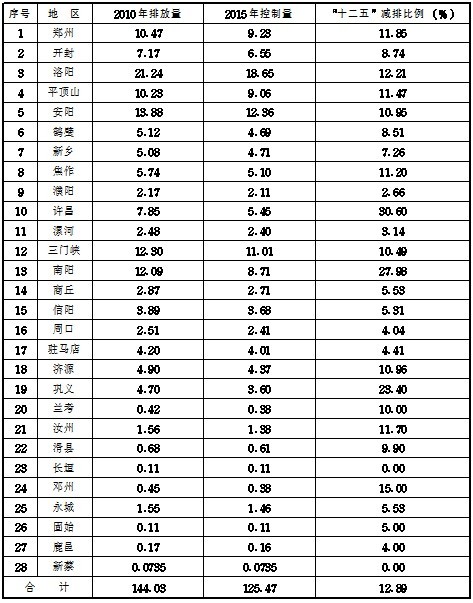 (二)主要目标。2015年全省万元生产总值能耗下降到0.937吨标准煤(按2005年价格计算),比2010年的1.115吨标准煤下降16%,比2005年的1.396吨标准煤下降32.9%;“十二五”时期,实现节约能源4500万吨标准煤。2015年全省化学需氧量和氨氮排放总量分别控制在133.5万吨、13.6万吨以内,比2010年的148.2万吨、15.6万吨分别减少9.9%(其中工业和生活排放量减少10%)、12.6%(其中工业和生活排放量减少12.9%);二氧化硫和氮氧化物排放总量分别控制在126.9万吨、135.6万吨以内,比2010年的144万吨、159万吨分别减少11.9%、14.7%。