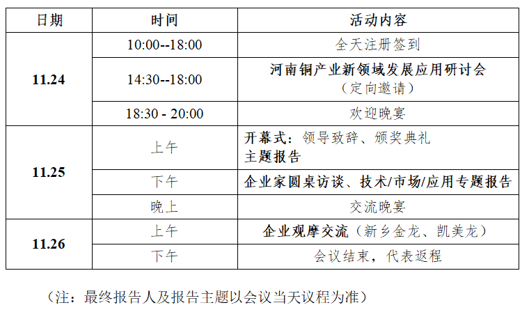 为积极响应国家高质量发展号召,深入贯彻省委省政府关于制造业高质量发展的战略部署,紧抓全球铜产业链供应链深度重构的战略机遇,前瞻谋划产业“十五五”发展蓝图,推动科技创新与产业创新深度融合,促进产业链上下游企业协同合作,培育壮大铜产业新质生产力,助力河南铜产业迈向更高质量、更高水平的发展新阶段,为河南省制造业强省建设贡献坚实的铜业力量,经研究决定,拟于2025年11月24-26日在河南省新乡市召开“2025河南先进铜基材料产业发展大会”。